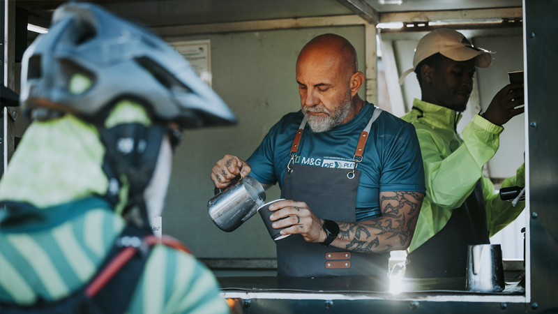 Theunis is always the first one up in the morning to ensure that everyone can get their coffee orders in before they are off on the next stage of the M&G Investments PE PLETT.
